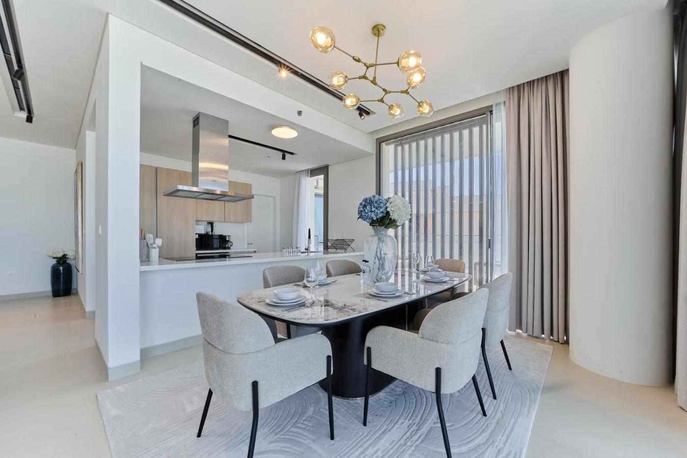 Three-Bedroom Apartment with Sea View. The spacious apartment has 3 bedrooms and 3 bathrooms with a bath or a shower and free toiletries. Guests can make meals in the kitchen that features a stovetop, a refrigerator, a dishwasher and kitchenware. The air-conditioned apartment features a flat-screen TV, a washing machine, a coffee machine, a dining area as well as sea views. The unit has 3 beds. ;