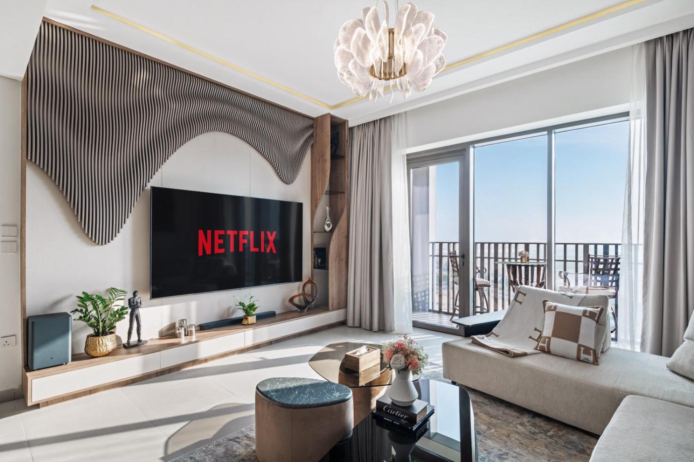 Set in Dubai, Breathtaking Dubai Skyline view apartment - By DuStay is a recently renovated accommodation, 11 km from The Dubai Fountain and 11 km from Dubai Mall. Situated on the beachfront, this property has a garden. There is a year-round outdoor pool and guests can make use of free WiFi, free private parking and an electric vehicle charging station.