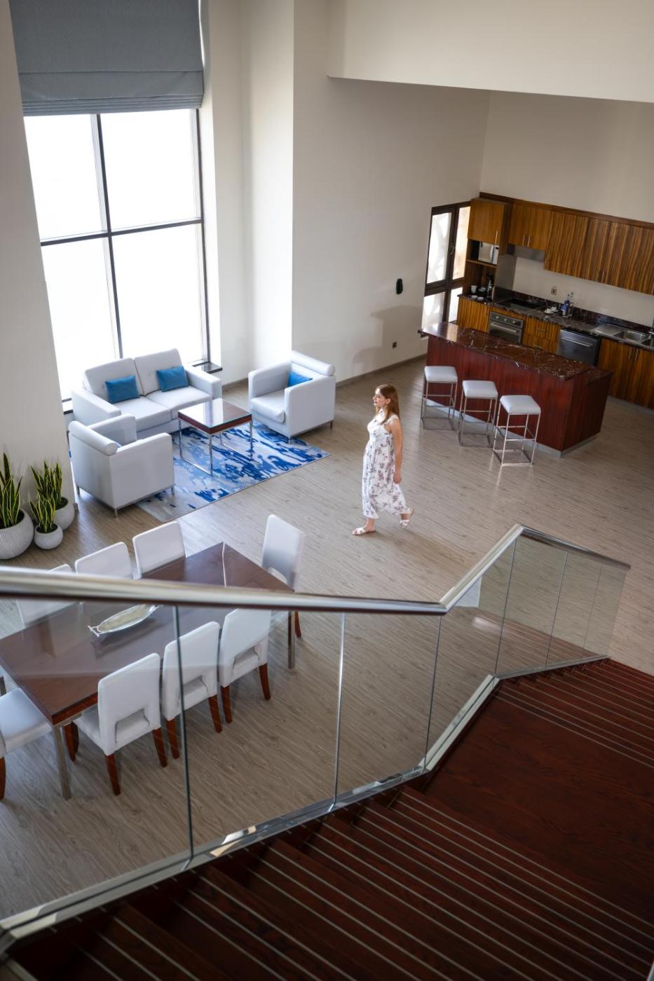 Duplex King Suite. On the 42nd floor, this duplex apartment offers loft courtyard view. This apartment has an open-plan living and dining area on the entrance floor with a modern and full kitchen. The staircase leads up to a fabulous mezzanine floor with an open bedroom and private bathroom . ;