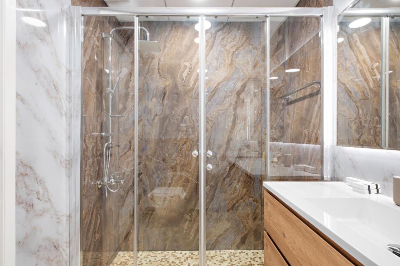 Three-Bedroom Apartment. Guests will have a special experience as this apartment features a private pool. This spacious apartment is comprised of 1 living room, 3 separate bedrooms and 4 bathrooms with a bath and free toiletries. In the well-fitted kitchen, guests will find a stovetop, a refrigerator, a dishwasher and kitchenware. Featuring a balcony, this apartment also offers air conditioning, a washing machine and a flat-screen TV. The unit offers 3 beds.