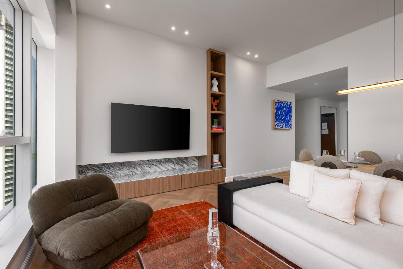The apartment also provides an outdoor swimming pool and a fitness room for guests to relax in.