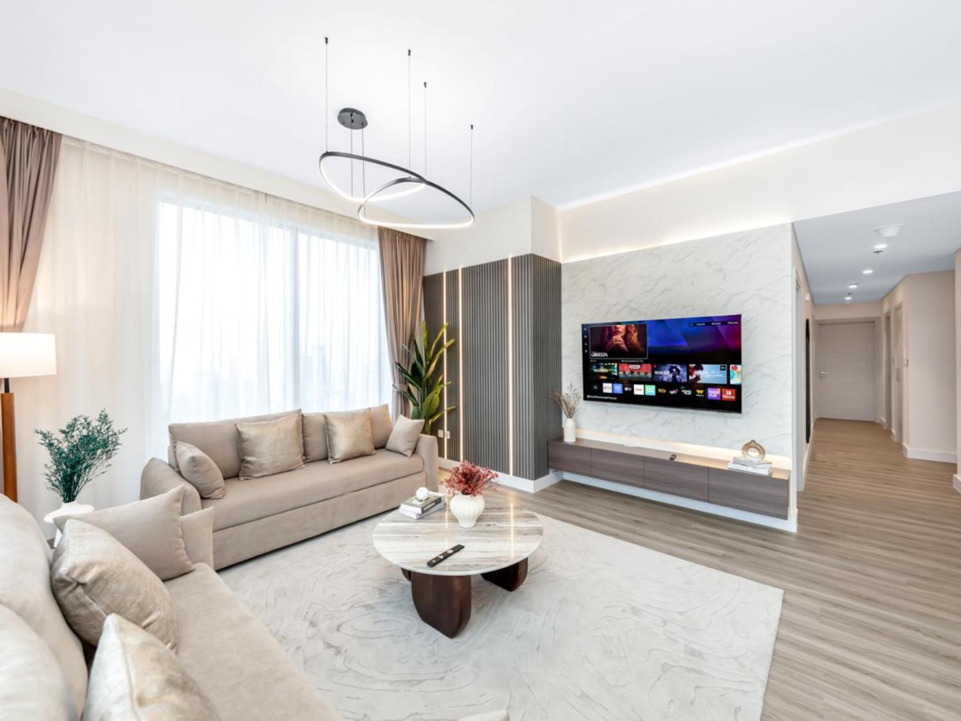 Four-Bedroom Apartment. This apartments special feature is the pool with a view. This spacious apartment consists of 1 living room, 4 separate bedrooms and 4 bathrooms with a bath and free toiletries. The fully equipped kitchen features a stovetop, a refrigerator, a dishwasher and kitchenware. The air-conditioned apartment provides a flat-screen TV with streaming services, a washing machine, a tea and coffee maker, a seating area as well as city views. The unit offers 7 beds.
